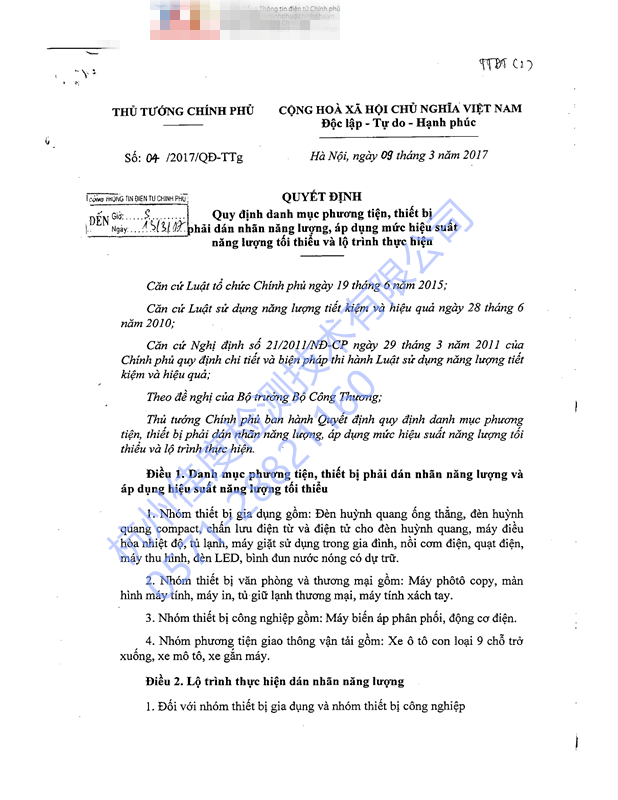 2.1越南总理04/2017/QD-TTg 的决议-强制能效的产品目录及其能效认证指南;
