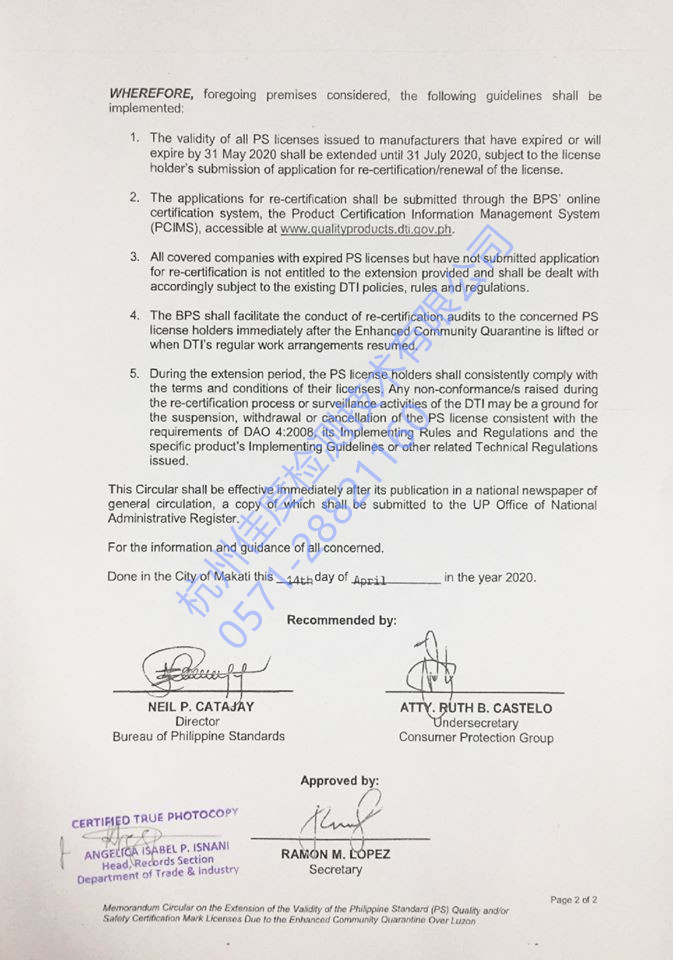 为了响应政府号召,菲律宾工贸部DTI目前都居家办公。2020年4月17号,菲律宾DTI-BPS签发了题为关于延长PS安全/质量证书有效期的20-17法案,法案规定: